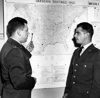Tuttavia, il 1952 vide il numero più alto di avvistamenti UFO, con non meno di 1.500 segnalazioni fatte alle autorità statunitensi. Il culmine fu raggiunto quando strani oggetti sorvolarono Washington DC, la capitale, osservati da testimoni a terra e registrati dai radar, viaggiando a velocità impossibili. Furono inviati aerei da caccia per raggiungerli, ma senza successo.